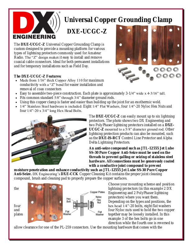 Nyloc nuts are installed, you can mount the DXE-UCGC-Z on your existing ground rod. Tighten the four