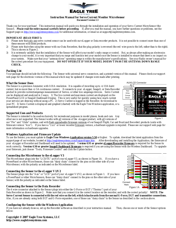 your PC. 3) Servo Current is displayed and graphed (charted) with the Eagle Tree Windows application, or a