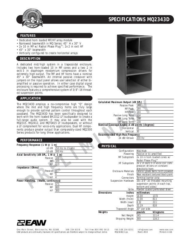EAW products are continually improved. All specifications are therefore subject to change without notice. MQ2343D/2 pp March 2003 Printed in USA