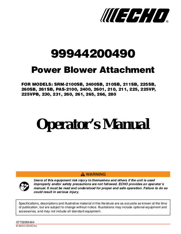 Echo 280, 225VP, 210SB, PAS-2100, 266, 260SB, 261, 260, 2400SB, 2400, 230, 225, 211SB, 225SB, 210, 211, 225VPB, 261SB, 265, 231, 2601, SRM-2100SB User Manual