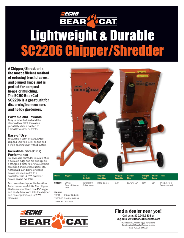 SC2206 206cc 29”x23”x50” 2 chip blades 2.75” 15.75" x 7.5"" 120 23" 8" x 1.75" yard