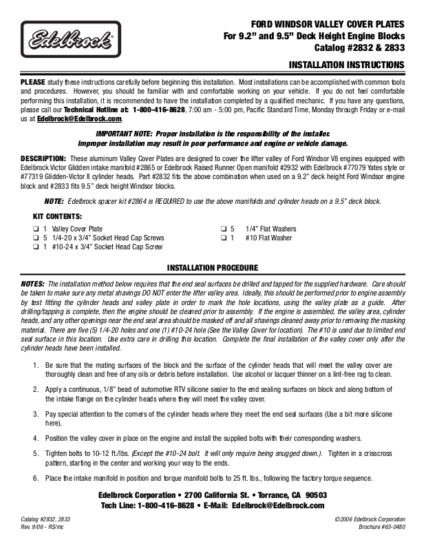 NOTE: Edelbrock spacer kit #2864 is REQUIRED to use the above manifolds and cylinder heads on a 9.5” deck block.