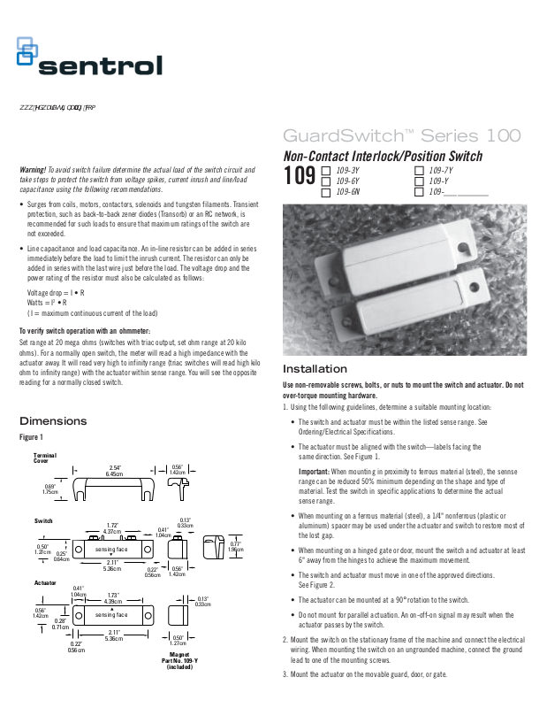 109-Y Actuator Only Included with all switches unless otherwise noted.