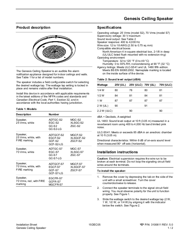 Wattage 25V (UL) 25V (ULC) 70V (UL) 70V (ULC)