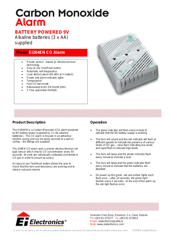 The Ei204EN is a Carbon Monoxide (CO) alarm powered