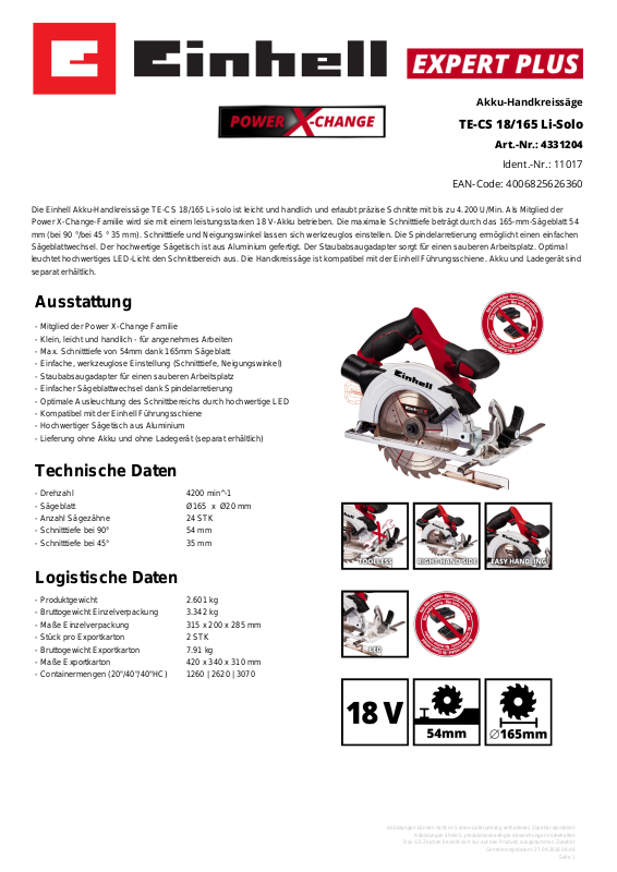 Mitglied der Power X-Change FamilieKlein, leicht und handlich - für angenehmes ArbeitenMax. Schnitttiefe von 54mm dank 165mm SägeblattEinfache, werkzeuglose Einstellung (Schnitttiefe, Neigungswinkel)Staubabsaugadapter für einen sauberen ArbeitsplatzEinfacher Sägeblattwechsel dank SpindelarretierungOptimale Ausleuchtung des Schnittbereichs durch hochwertige LEDKompatibel mit der Einhell FührungsschieneHochwertiger Sägetisch aus AluminiumLieferung ohne Akku und ohne Ladegerät (separat erhältlich)-