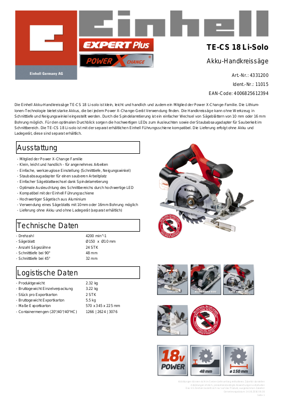Schnittbereich. Die TE-CS 18 Li-solo ist mit der separat erhältlichen Einhell Führungsschiene kompatibel. Die Lieferung erfolgt ohne Akku und
