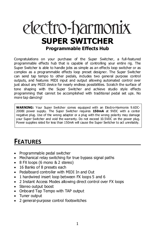 WARNING: Your Super Switcher comes equipped with an Electro-Harmonix 9.6DC-