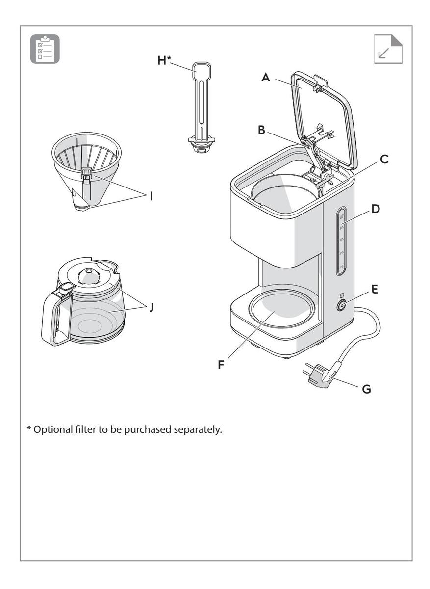 Вставте паперовий фільтр розміром 1х4 у тримач фільтра та наповніть його меленою кавою. Для кави середньої міцності достатньо 6-7 г кавового порошку на чашку. Закрийте кришку резервуара для води та встановіть чашу назад (закрийте кришкою).