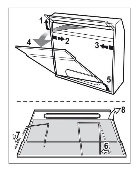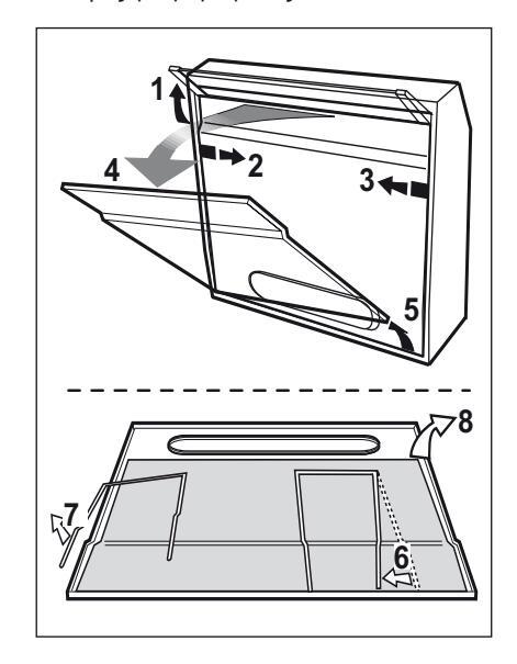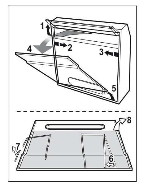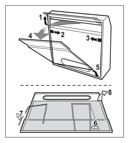 4.1 Φίλτρο για τα λίπη - Πρέπει να καθαρίζεται μια φορά τον μήνα με απορρυπαντικά που δεν χαράζουν, είτε στο χέρι ή στο πλυντήριο πιάτων, το οποίο πρέπει να ρυθμιστεί σε χαμηλή θερμοκρασία και σε σύντομο κύκλο. Με το πλύσιμο στο πλυντήριο πιάτων, το φίλτρο για τα λίπη μπορεί ελαφρώς να χάσει το χρώμα του αλλά αυτό δεν μεταβάλλει τις ιδιότητες φιλτραρίσματος.
