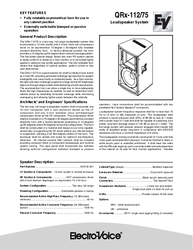 The QRx-112/75 is a two-way, full-range loudspeaker system that