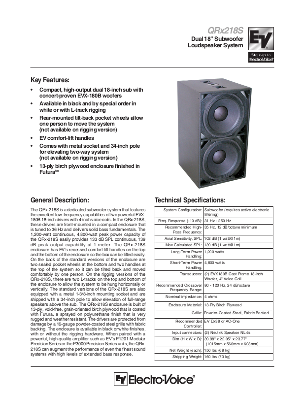 the excellent low-frequency capabilities of two powerful EVX180B 18-inch drivers with 4-inch voice coils. In the QRx-218S,