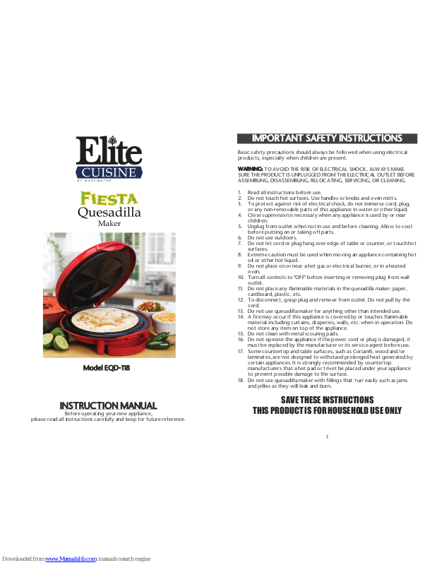 12. Desconecte la quesadillera del toma corriente cuando no este en uso.