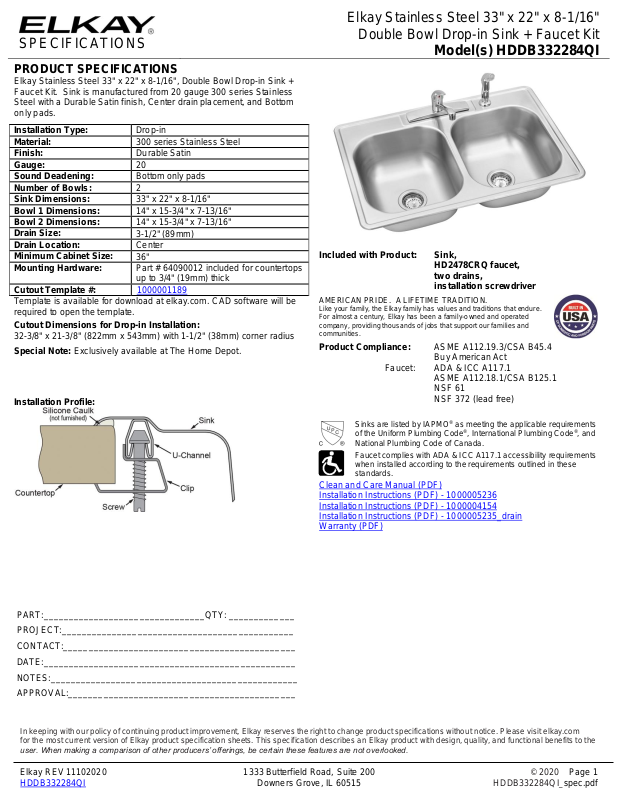 for the most current version of Elkay product specification sheets. This specification describes an Elkay product with design, quality, and functional benefits to the