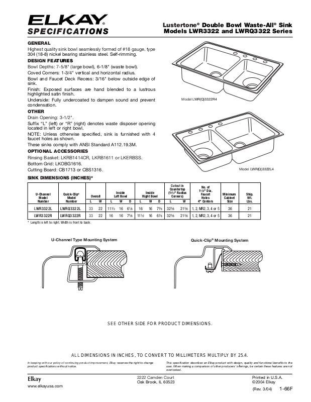 In keeping with our policy of continuing product improvement, Elkay reserves the right to change
