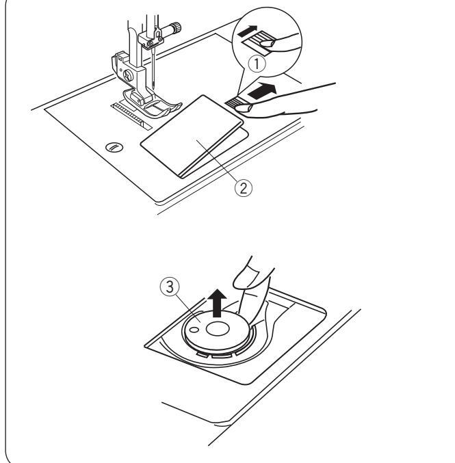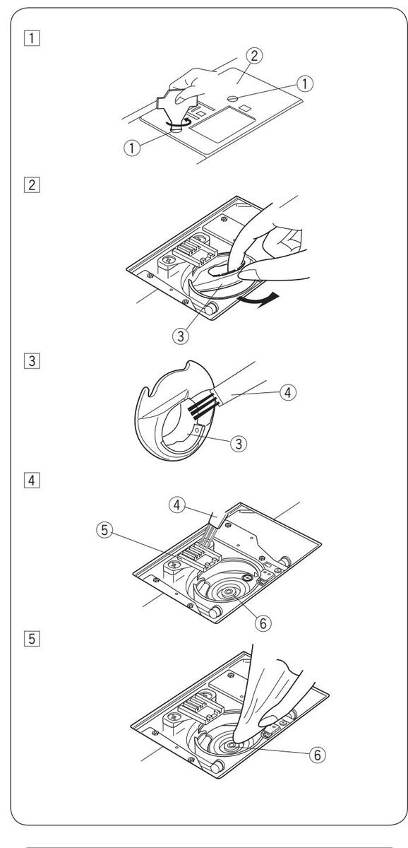 Naciśnij przycisk podnoszenia/opuszczania igły, aby ją unieść, po czym wyłącz zasilanie i wyjmij wtyczkę z kontaktu. Usuń igłę i stopkę dociskową. Usuń pokrywę bębenka, przesuwając przycisk zwalniający płytkę w prawo. Wyciągnij szpulkę i wyczyść ją przy pomocy pędzelka (możesz również użyć odkurzacza).