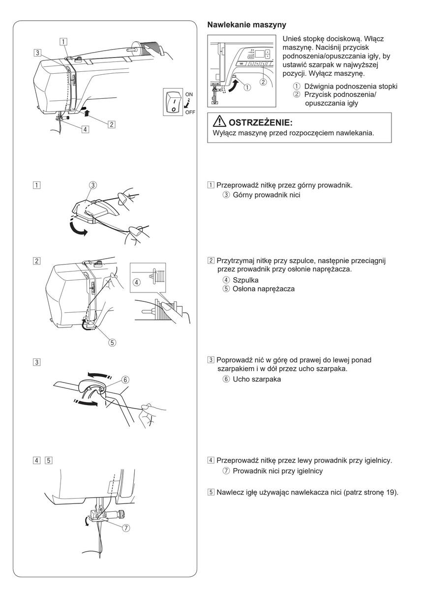 14. Należy wyłączyć maszynę podczas wszelkich czynności regulacyjnych przy igle, takich jak nawlekanie igły, zmiana igły, nawlekanie szpulki bębenka, wymiana stopki dociskowej, itd.