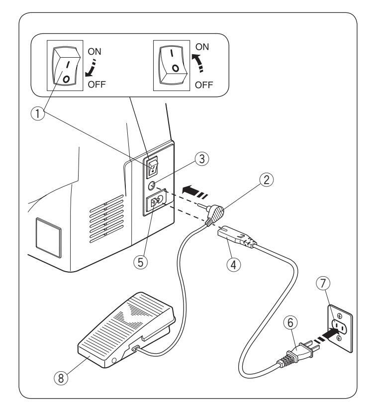 4. Nie wolno korzystać z urządzenia, jeśli którykolwiek z otworów wentylacyjnych jest zablokowany. Należy dbać o to, by otwory wentylacyjne maszyny oraz rozrusznika nożnego były wolne od zalegającego kurzu. 5. Nie wolno wtykać ani wkładać żadnych obcych objektów do otworów w maszynie.