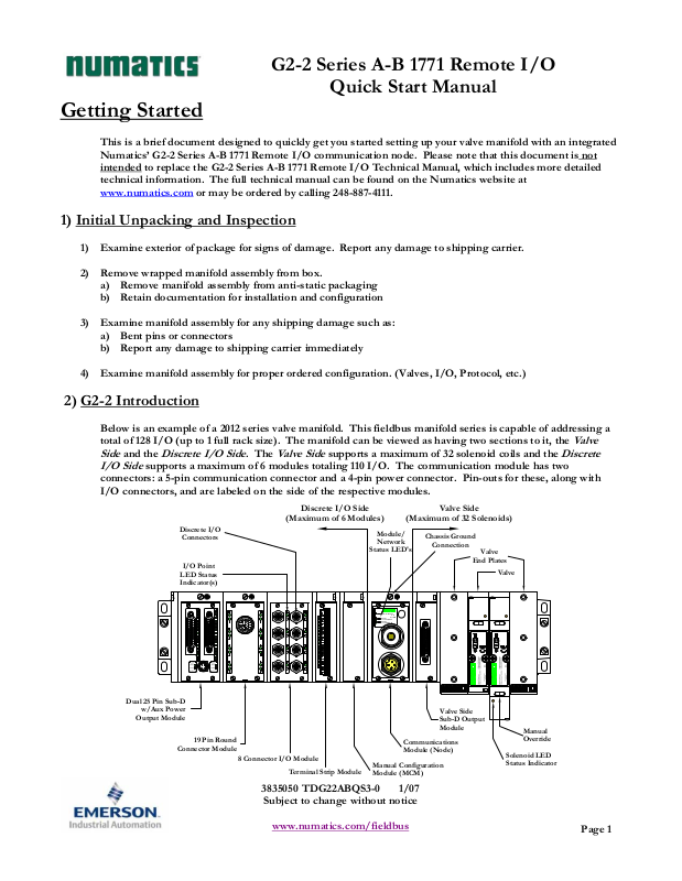Numatics’ G2-2 Series A-B 1771 Remote I/O communication node. Please note that this document is not