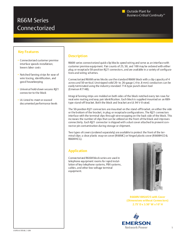 NOTE: All part numbers listed are connectorized for cabling stub up unless otherwise noted. Cabling stub down and other special wiring options are available. Please contact your Emerson Outside Plant account representative for part numbers and availability.