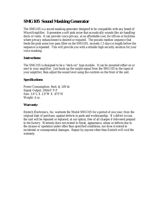 Emtech Electronics, Inc. warrants the Model SMG105 for a period of one year, from the