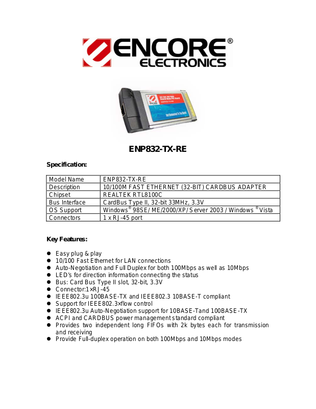 Description 10/100M FAST ETHERNET (32-BIT) CARDBUS ADAPTER
