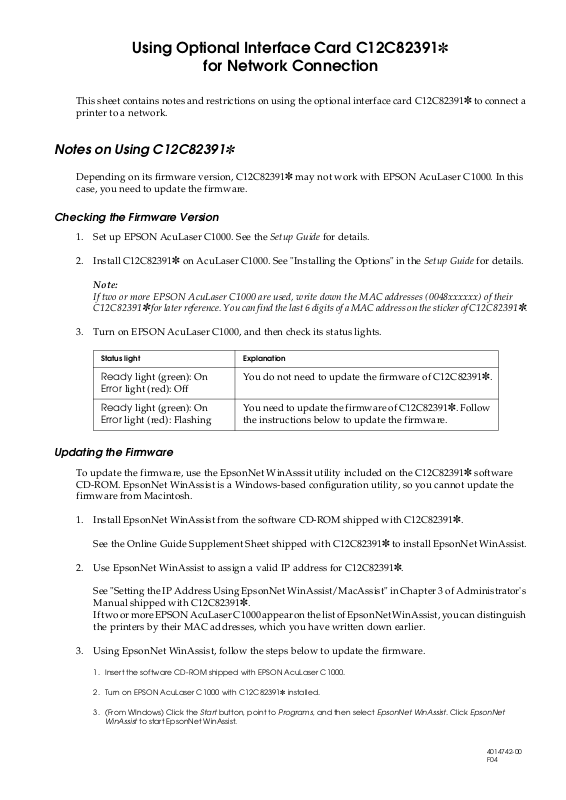 1. Install EpsonNet WinAssist from the software CD-ROM shipped with C12C82391