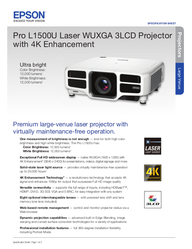 output measured in accordance with ISO 21118. | 2 4K Enhancement Technology shifts each pixel diagonally by 0.5 pixels to double the resolution to 3840 x 2400 and surpass Full HD image