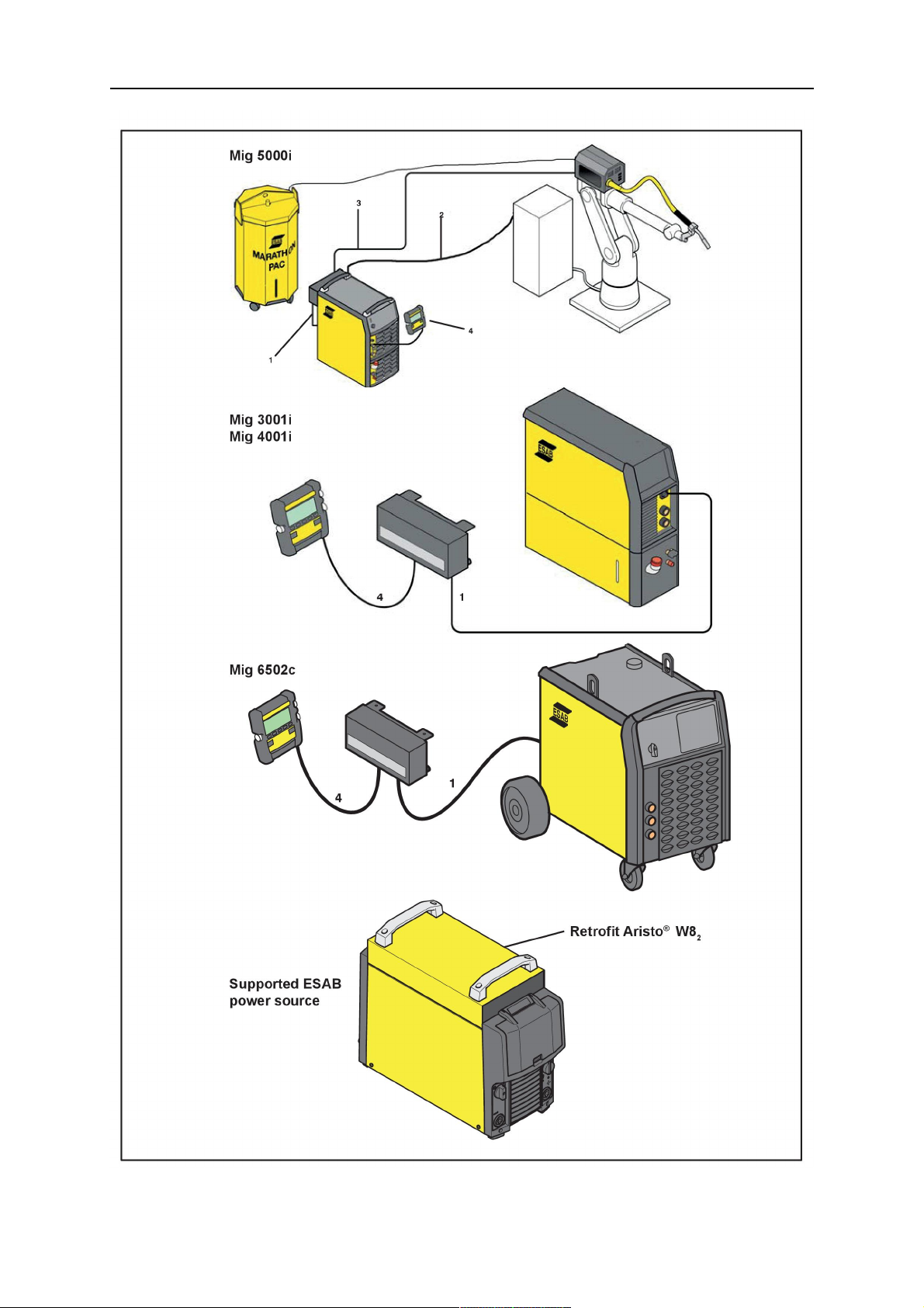 Připojení systému Aristo® W82 knapájecím zdrojům Mig 3001i, Mig 4001i a Mig 6502c