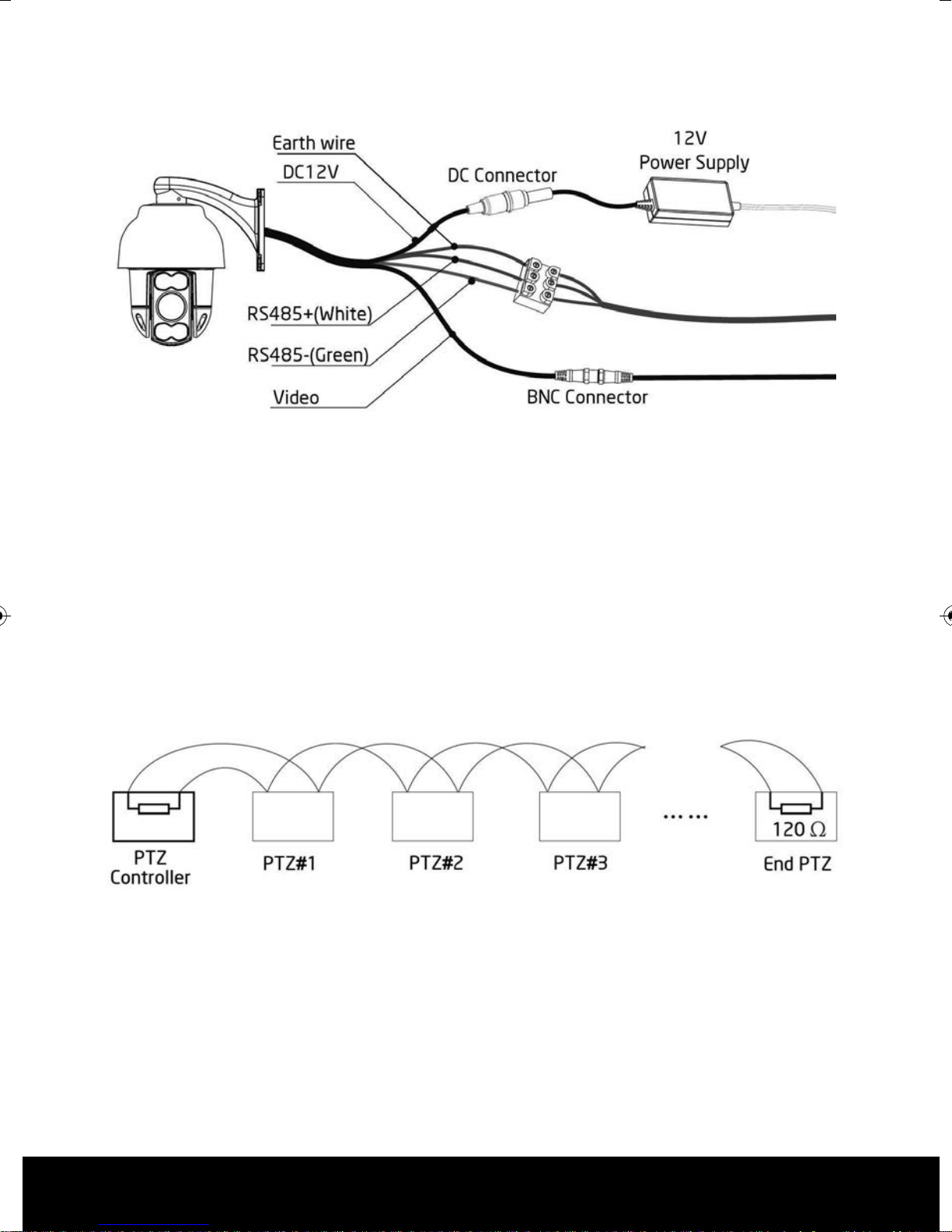 Multiple PTZ cameras must have the RS485 control cable wired in parallel. The last PTZ
