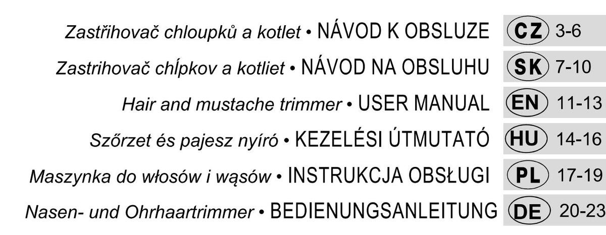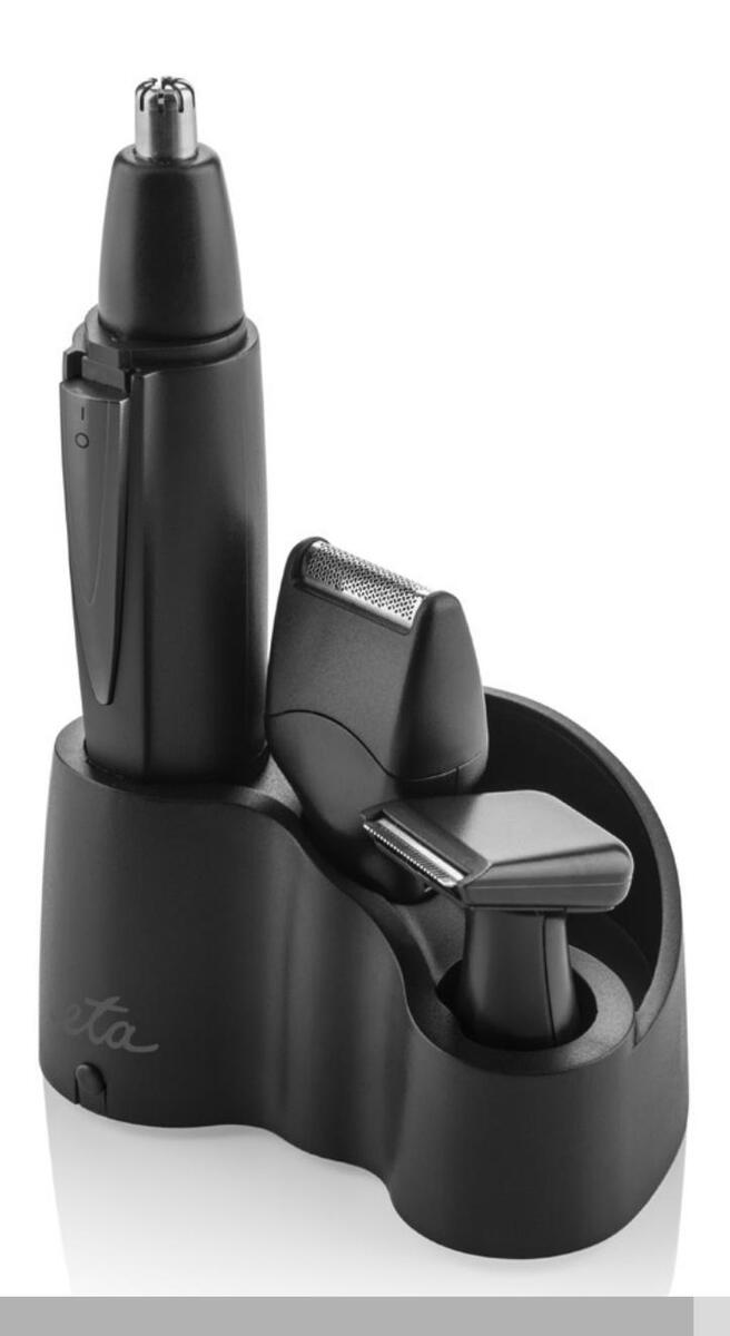 Zdjąć pokrywę baterii. Włożyć 1 szt. baterii AA alkaliczne (patrz symbol) zwracając uwagę na właściwą polaryzację. Pokrywę ponownie założyć. Umieścić wybraną nasadkę i odpowiednio zabezpieczyć. Urządzenie należy włączyć a po użyciu wyłączać za pomocą przełącznika. Włosy w nosie i uszach należy usuwać ruchami okrężnymi. Tworząc kontury należy trzymać trymer prostopadle do skóry.