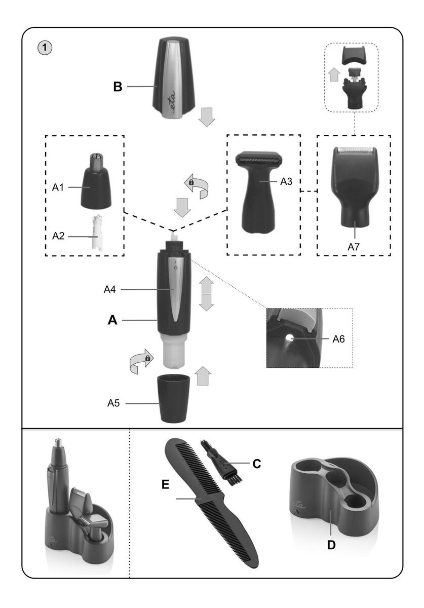 A1 – głowica przycinająca (przeznaczona do usuwania włosów w nosie, uszach lub brwi) A2 – uchwyt z ostrzami