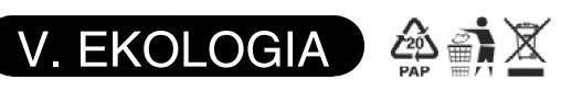 Jeżeli tylko pozwoliły na to rozmiary, na wszystkich elementach wydrukowano znaki materiałów zastosowanych do produkcji opakowań, komponentów i wyposażenia, jak również ich przetwarzania wtórnego. Symbole umieszczone na produktach lub w załączonej dokumentacji oznaczają, że zastosowanych elementów elektrycznych lub elektronicznych nie można poddawać utylizacji wraz z odpadem komunalnym. Produkt należy odnieść do specjalnych punktów zbiorczych, w których będą przyjęte bez opłaty. Dzięki poprawnej utylizacji pomogą Państwo zachować cenne źródła i pomogą w profilaktyce ewentualnych negatywnych wpływów na środowisko naturalne i zdrowie ludzkie. W celu uzyskania innych szczegółowych informacji dotyczących utylizacji należy zwrócić się do najbliższego urzędu lub punktu zbiorczego. Niewłaściwy sposób utylizacji urządzenia może podlegać karze – zgodnie z przepisami krajowymi i międzynarodowymi. Bezpieczne usuwanie zużytych baterii, za pośrednictwem specjalnych punktów zbiórki. Nigdy nie wrzucać baterii do ognia!