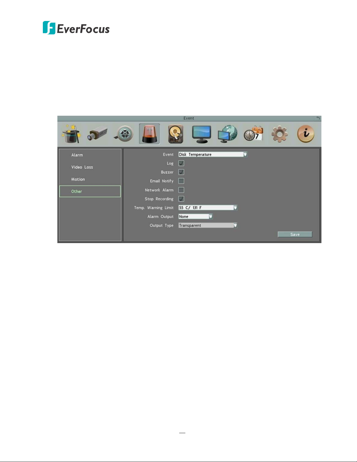 Temp. Warning Limit: Sets the trigger temperature for System / HD Temperature event