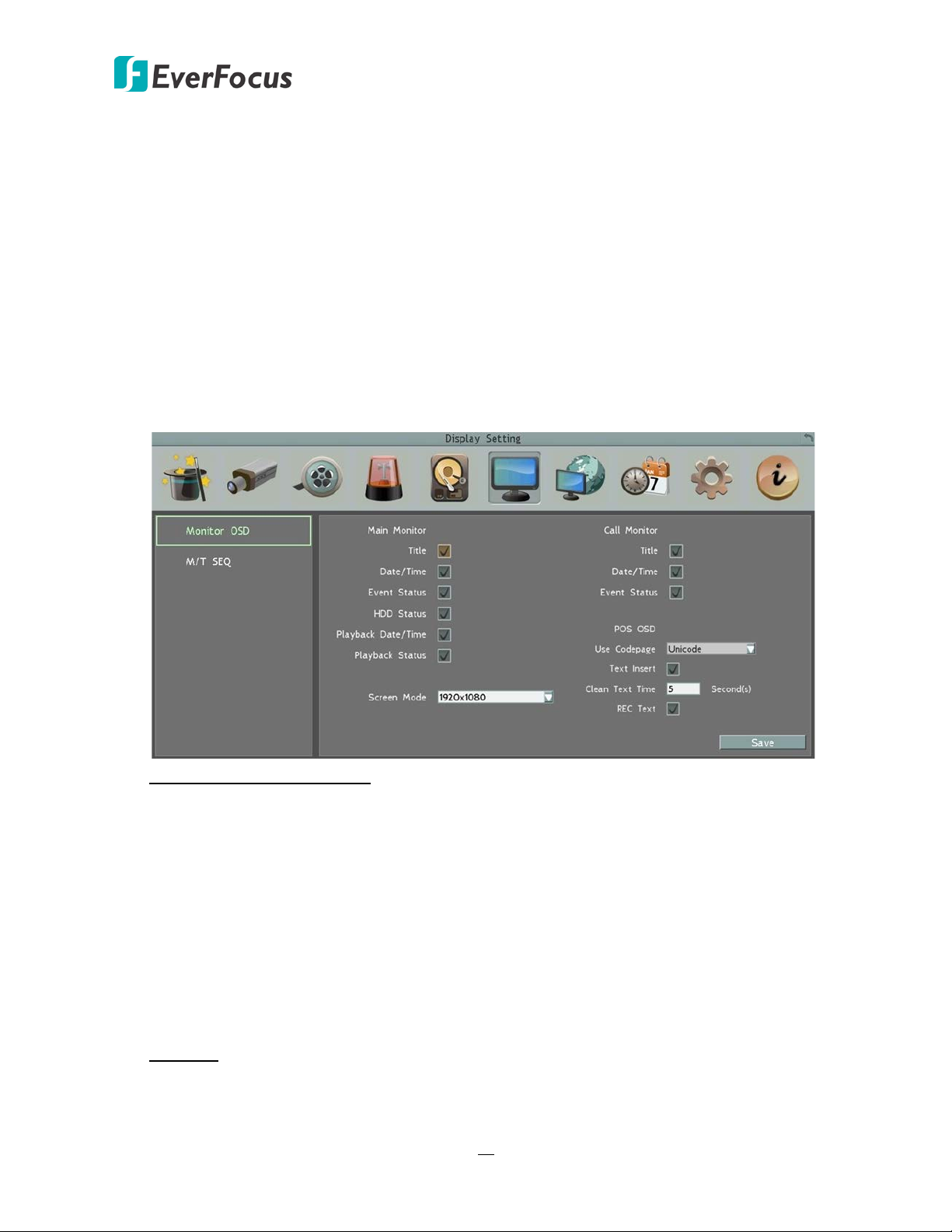 Monitor settings below can be applied to both of the 2 main monitors. For DVRs with 2 call