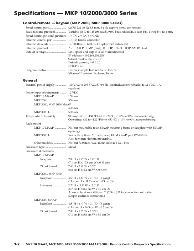 MKP 10 MAAP, MKP 2000, MKP 3000/3000 MAAP/3000 L Remote Control Keypads • Specifications