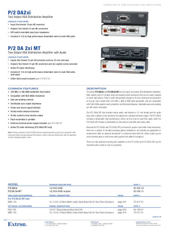 The Extron P/2 DA2xi and P/2 DA2xi MT are one input, two output, VGA distribution amplifiers.