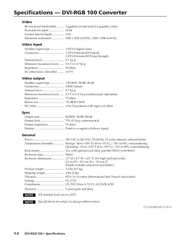 Minimum/maximum levels ...... 0.5 V to 1.0 Vp-p