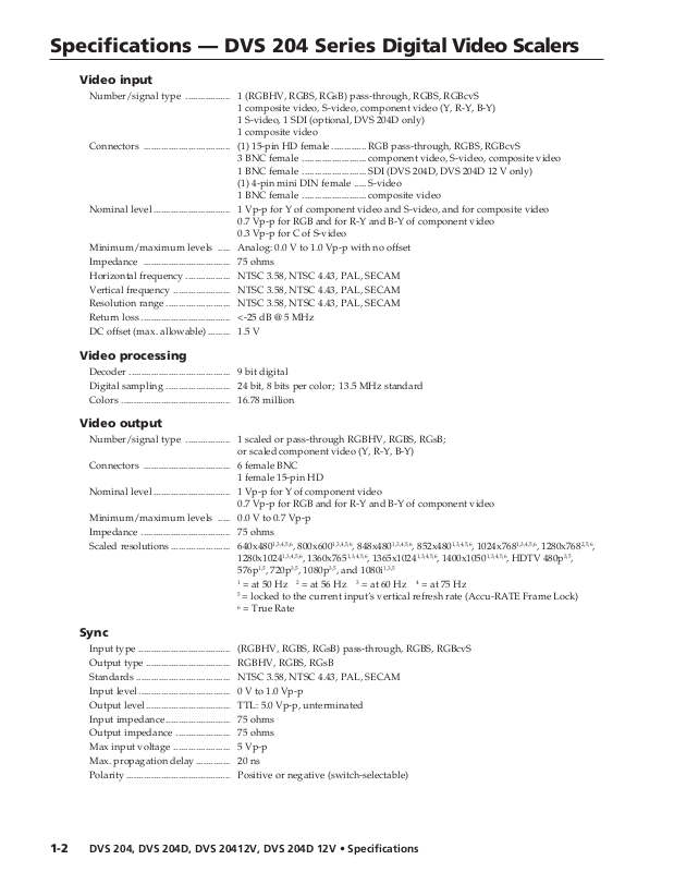 Specifications — DVS 204 Series Digital Video Scalers