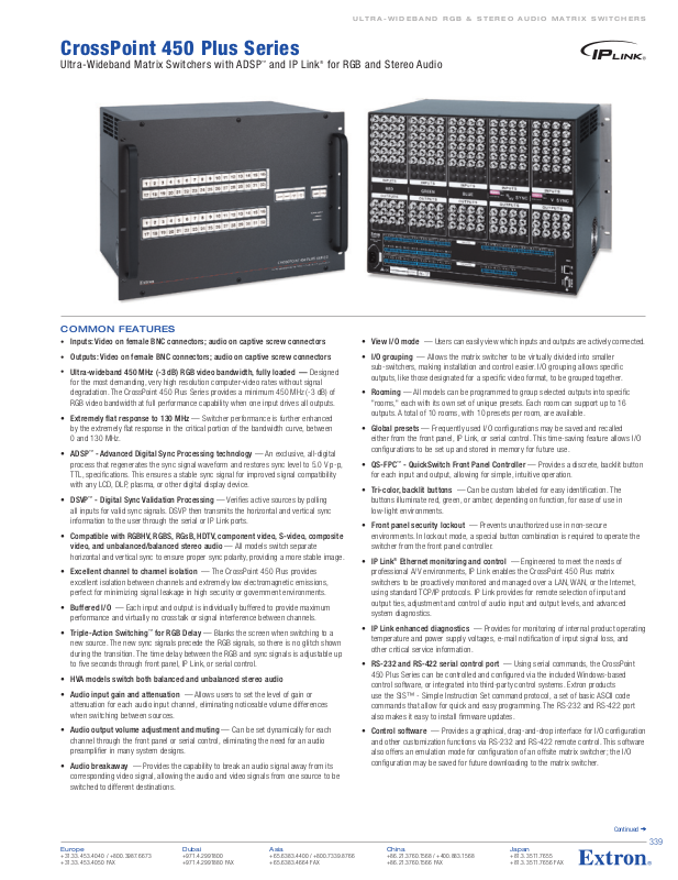 professional A/V environments, IP Link enables the CrossPoint 450 Plus matrix