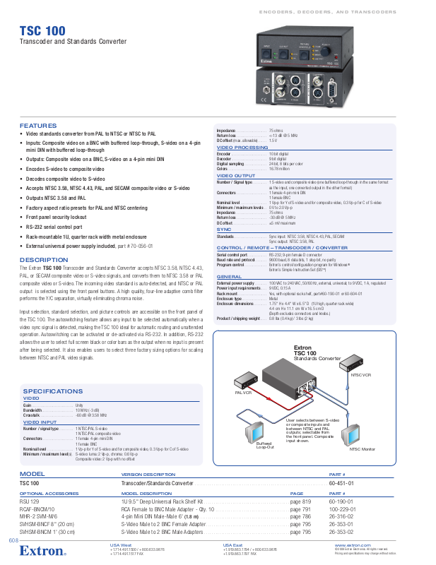 The Extron TSC 100 Transcoder and Standards Converter accepts NTSC 3.58, NTSC 4.43,