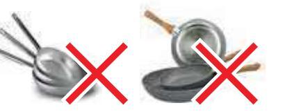 Garnki z niemagnetycznym lub tylko częściowo magnetycznym dnem. o wymiarach mniejszych niż wskazane wymiary minimalne i które nie są idealnie płaskie, nie nadają się do użytku na płytach indukcyjnych. Nieodpowiednie garnki (przykłady):