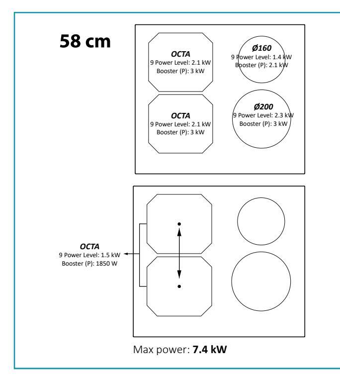Włącza 3 strefy gotowania o różnych mocach gr- zewczych. |