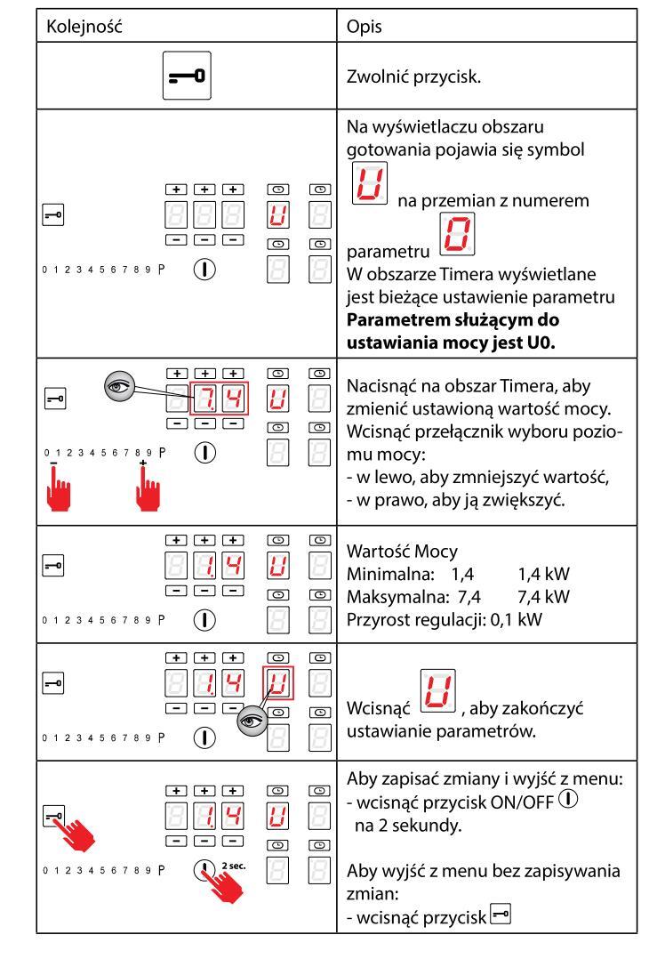 Zanim elementy płyty kuchennej nadmiernie się nagrzeją, mechanizm sterujący zmniejsza pobór mocy, zgodnie z poniższą procedurą środków bezpieczeństwa: