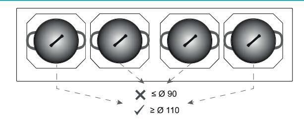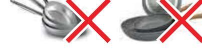 Garnki z niemagnetycznym lub tylko częściowo magnetycznym dnem, o wymiarach mniejszych niż wskazane wymiary minimalne i które nie sa idealnie płaskie, nie nadają się do użytku na płytach indukcyjnych. Nieodpowiednie garnki (przykłady):