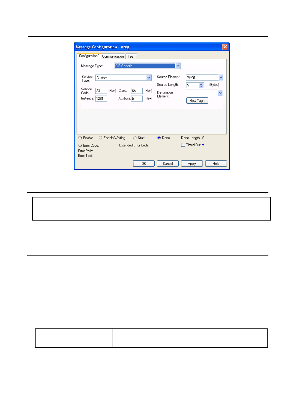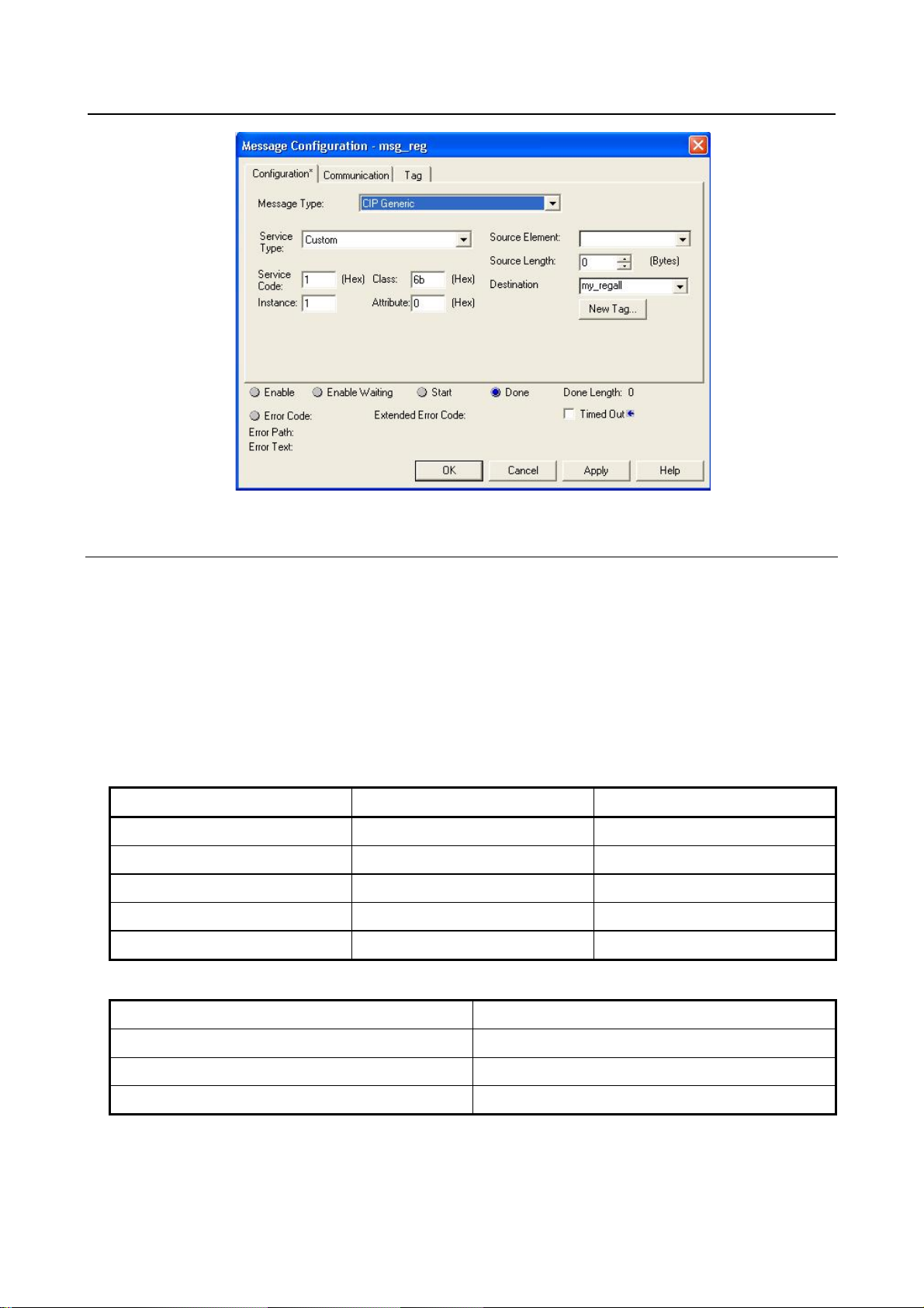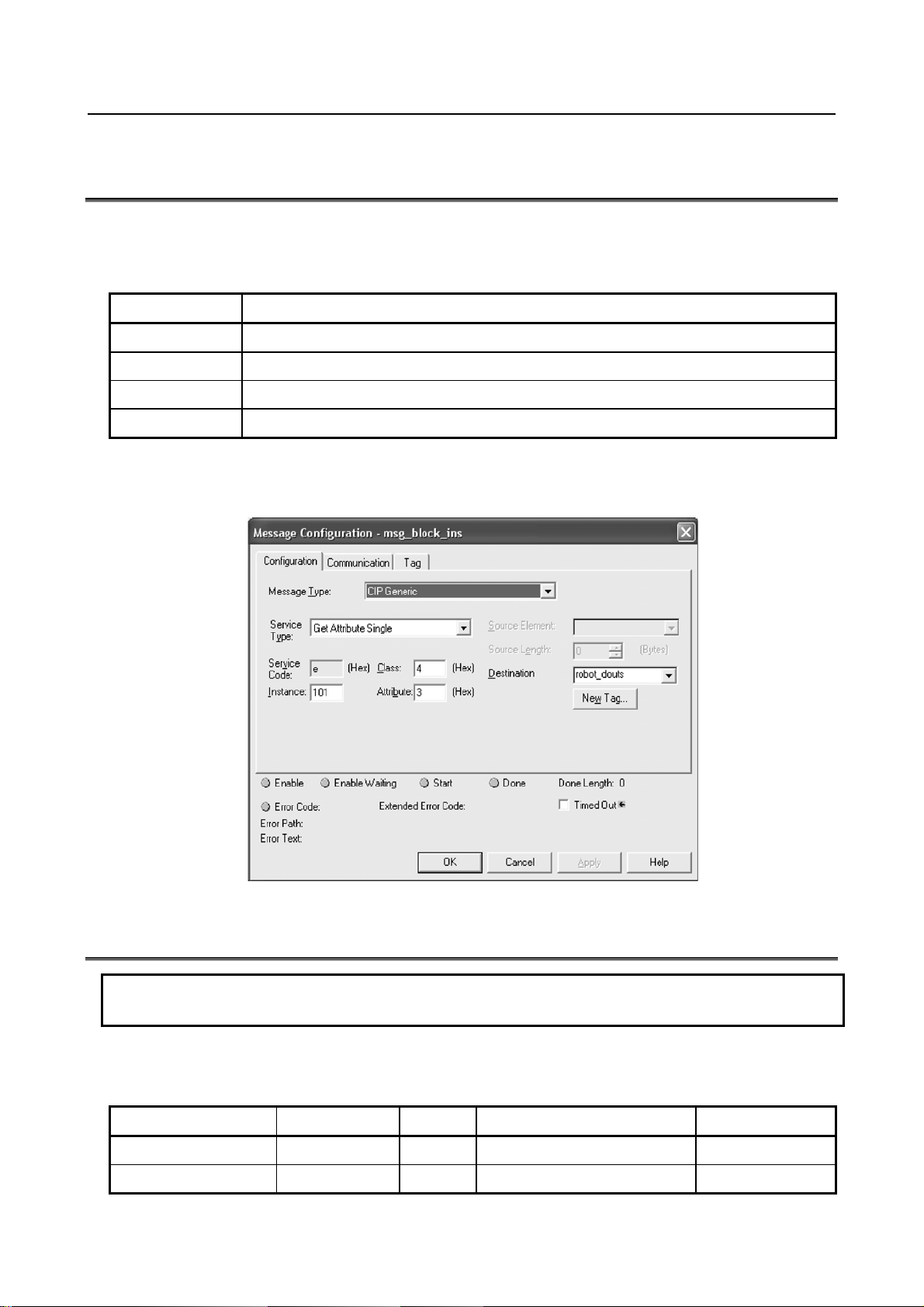 Configuration of the message block requires the Class, Instance, Attribute, and Service values as