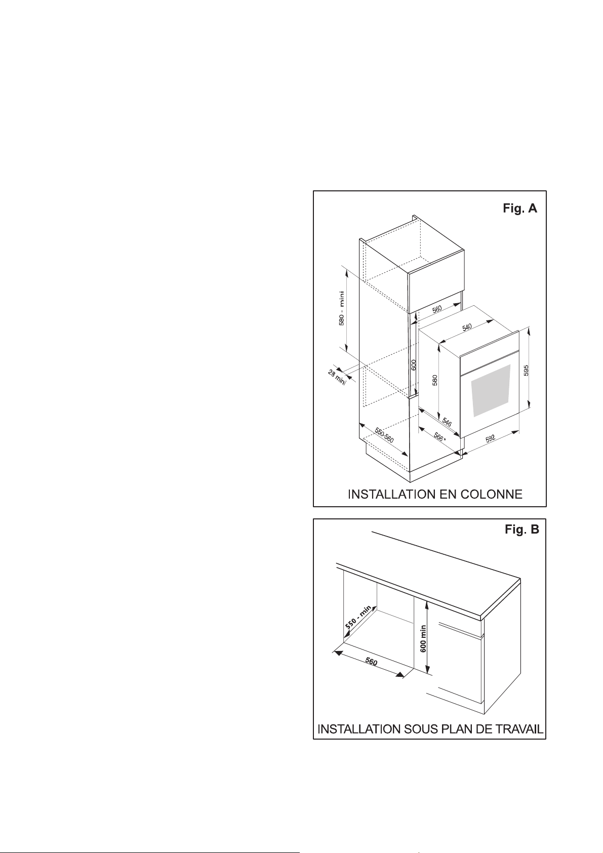 Le four doit être installé dans un meuble d'encastrement (fig. A ou B) qui doit être monté et fixé de