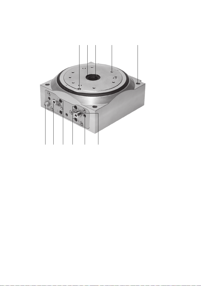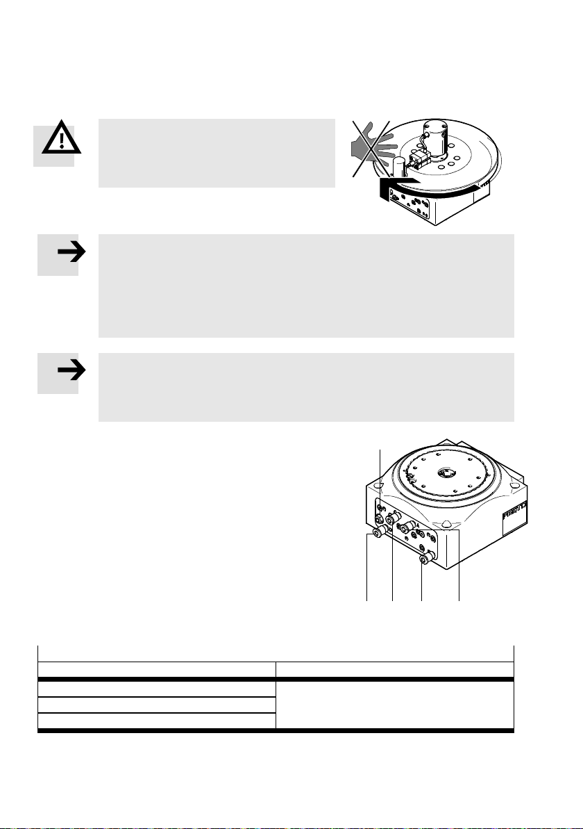 ein Ritzel die Linearbewegung in eine Schwenkbewegung. Ein zweites Kolbenpaar steuert den Eingriff des Ritzels in die Tischverzahnung und die Verriegelung der Halteposition. Der integrierte Stoßdämpfer bremst den Rundschalttisch in Drehrichtung ab.