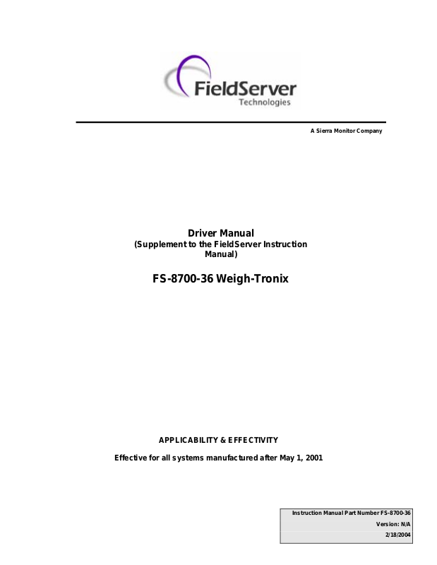 over either RS-232 or RS-485 using Weigh-Tronix protocol. The FieldServer emulates a