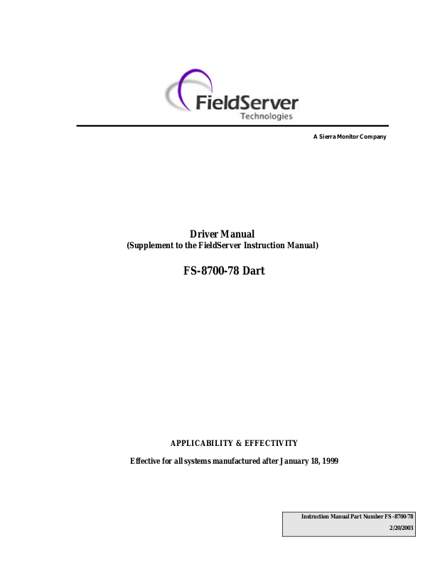 The FieldServer is connected to the RS232 serial port of the Dart. The Fieldserver can read and